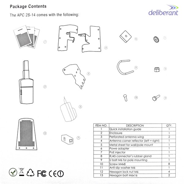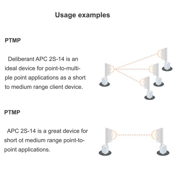 The APC 2S-14 presents a 2.4GHz CPE product with superior performance and flexibility. This product is equipped with an extreme output power (up to 31 dBm) 802.11n radio that was created with a unique hardware design and coupled with a reliable, feature-rich operating system. This small device also has a robust, IP-65 compliant enclosure which is combined with a medium gain corner reflector, and emits EIRP up to 10 W. The APC 2S-14 is generally designed for CPE applications but can also act as an access point thus allowing point to point and point to multipoint network applications.