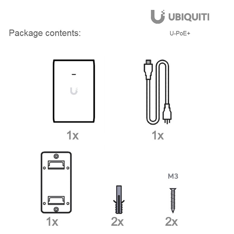 Contains RJ45 data input, AC cable with earth ground, and PoE+ output