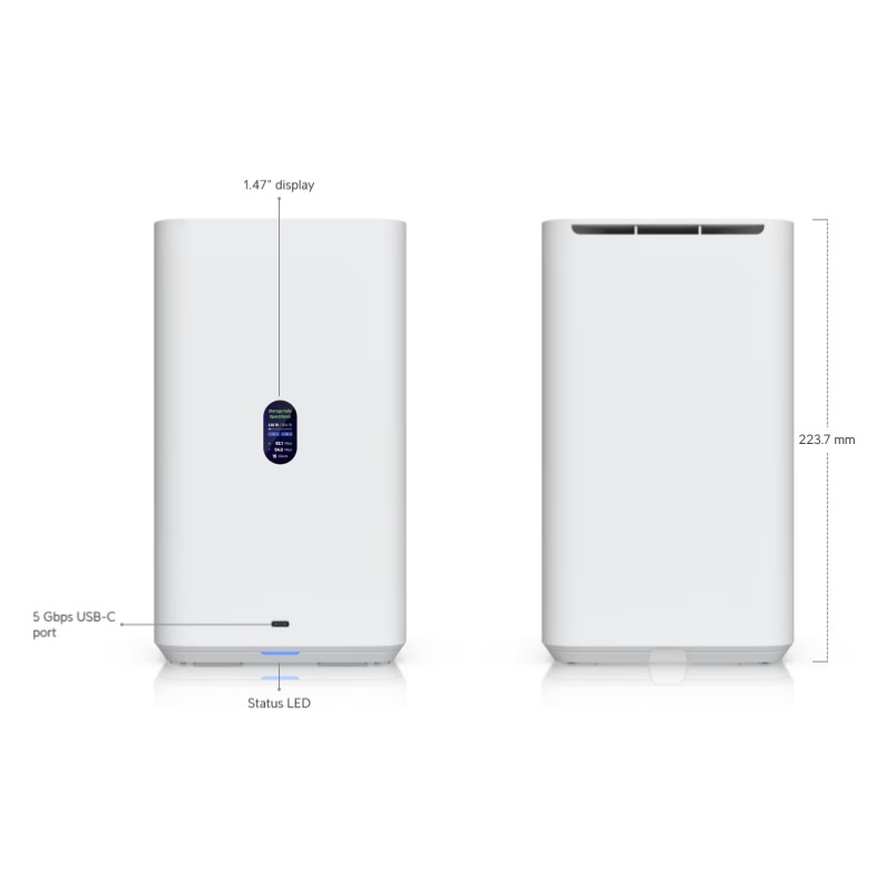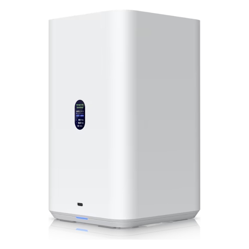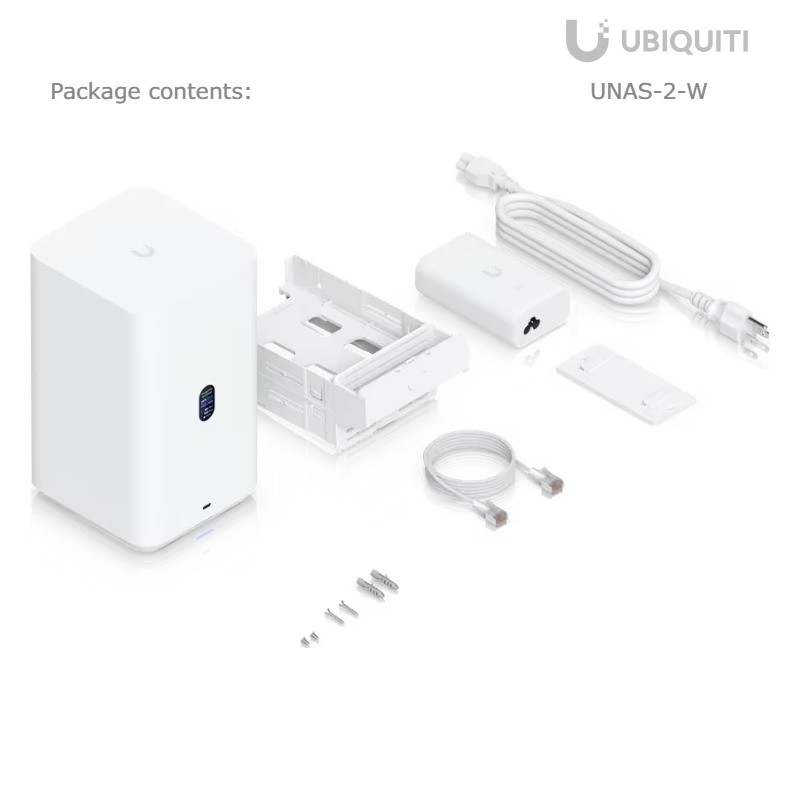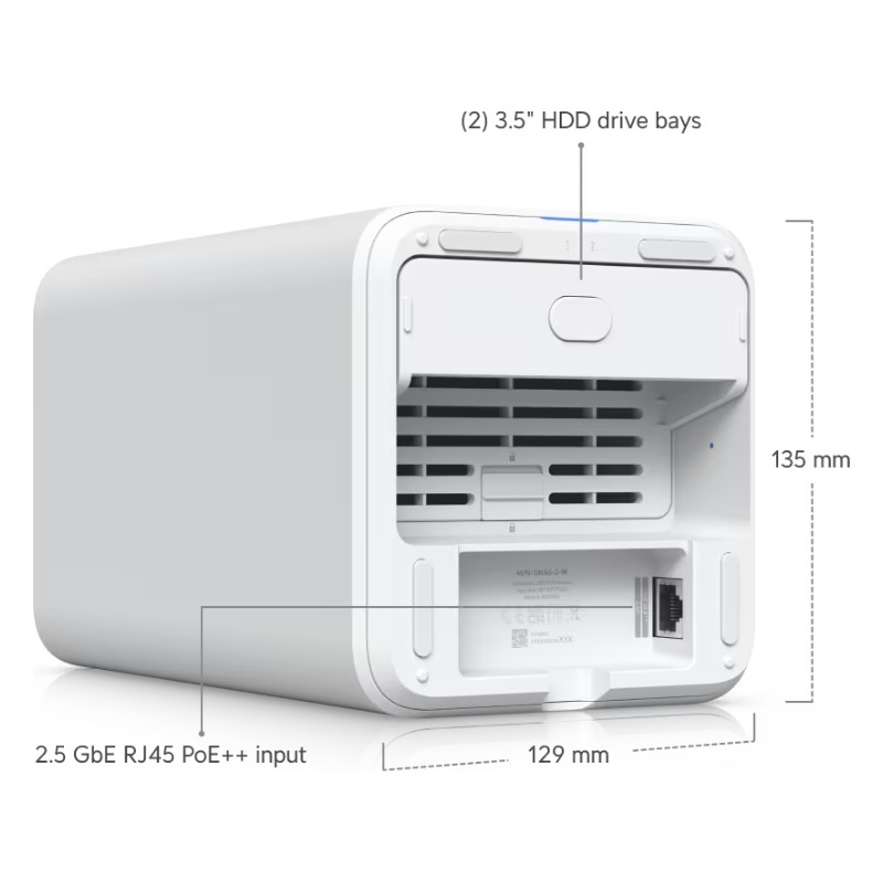 UniFi Network Attached Storage with (2) 3.5" HDD bays, 2.5 GbE networking, USB-C connectivity, and an included PoE++ adapter, all in a compact footprint.