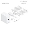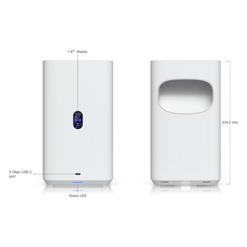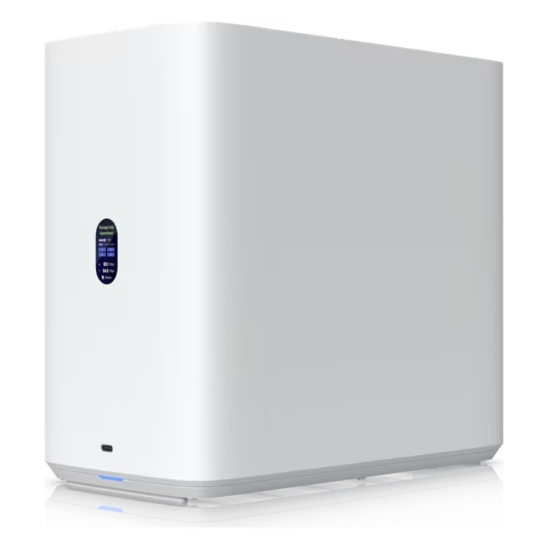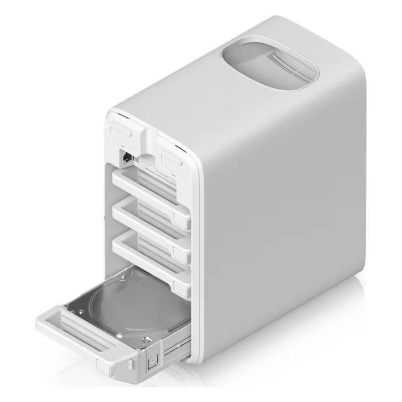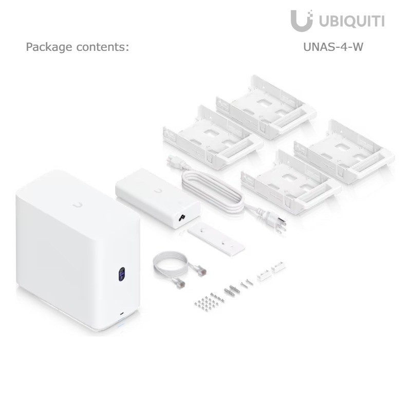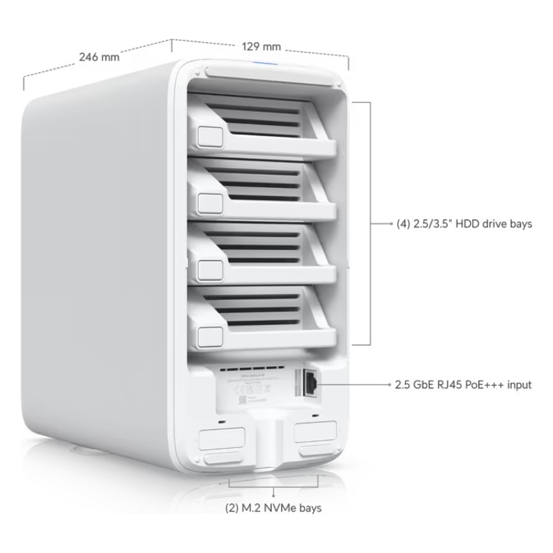 UniFi Network Attached Storage with (4) 2.5/3.5" HDD bays, (2) M.2 NVMe SSD cache slots, 2.5 GbE networking, USB-C connectivity, and an included PoE+++ adapter, all in a compact footprint.
