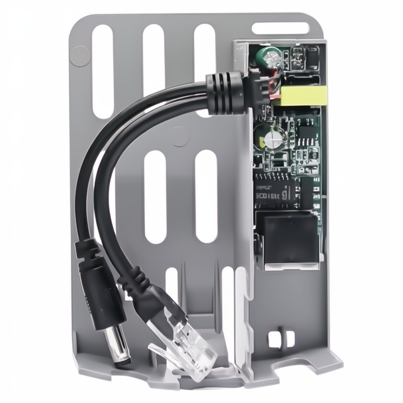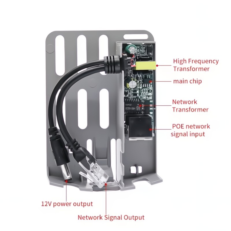 It accepts 802.3af/at PoE to output fixed 12v/1.2A via the DC Jack (5.5 x 2.1mm) and 10/100 RJ45 Jack.