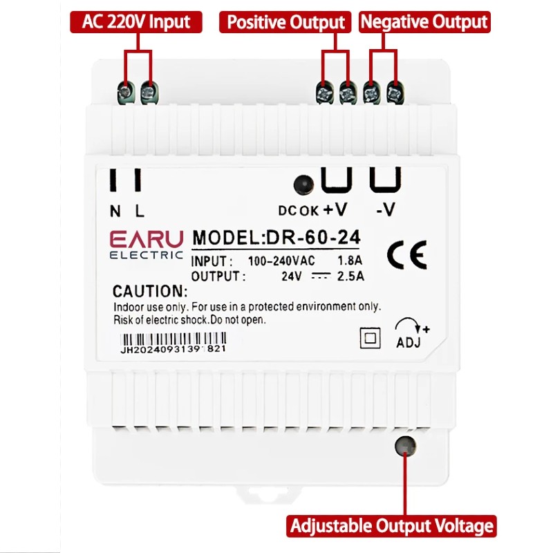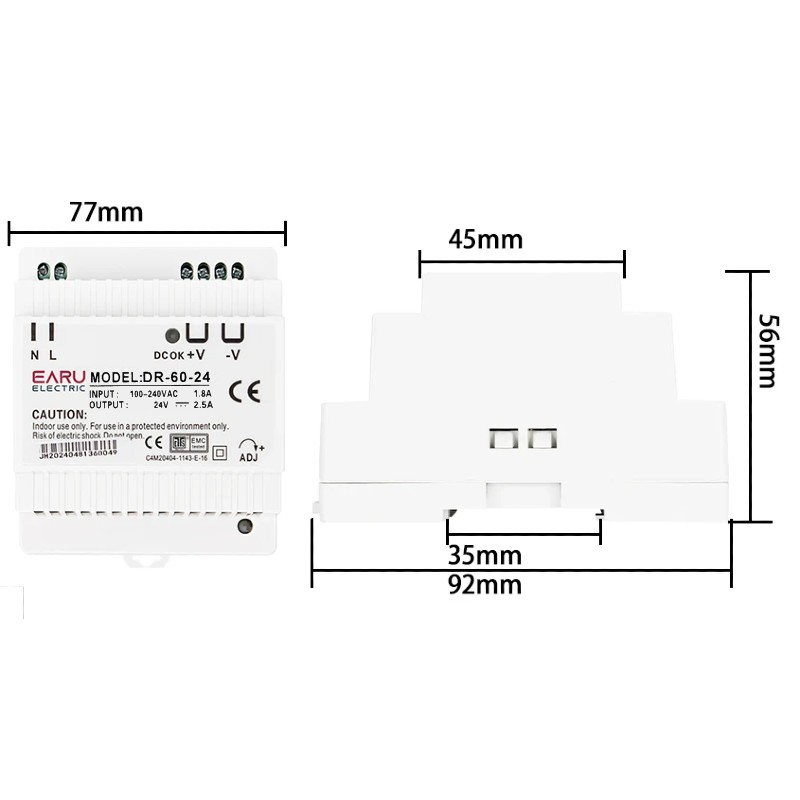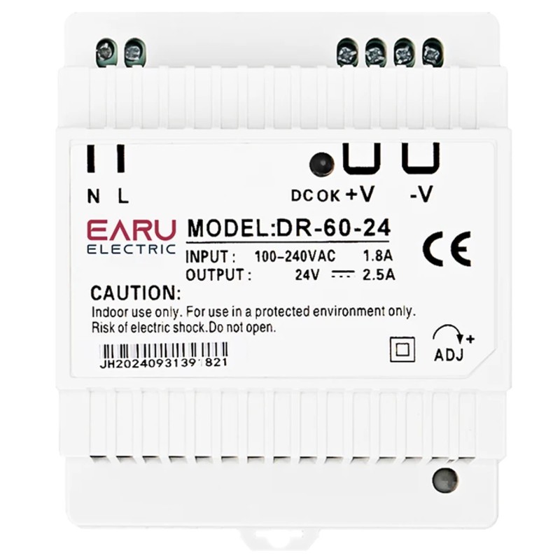 EARU DR-60-24. AC-DC Industrial DIN rail power supply. Output 24Vdc at 2.5A. Plastic T-shape case