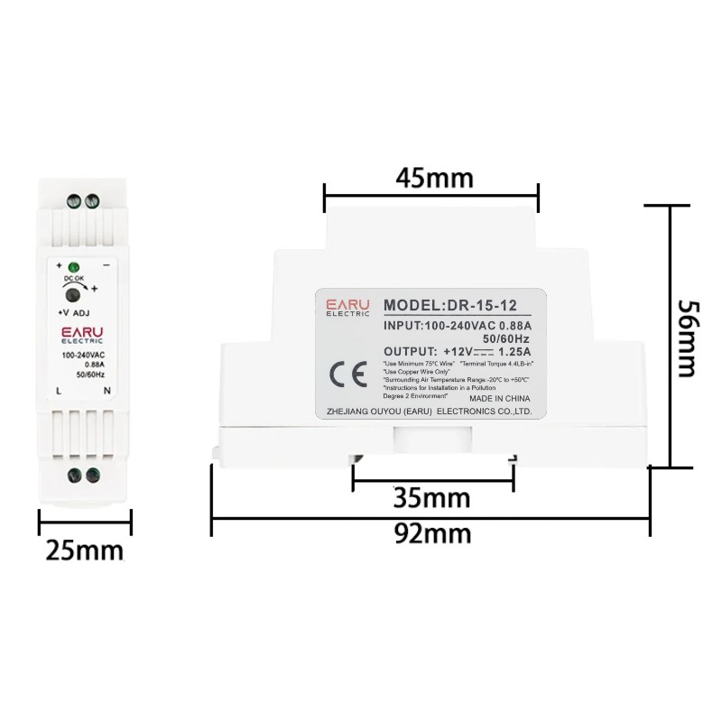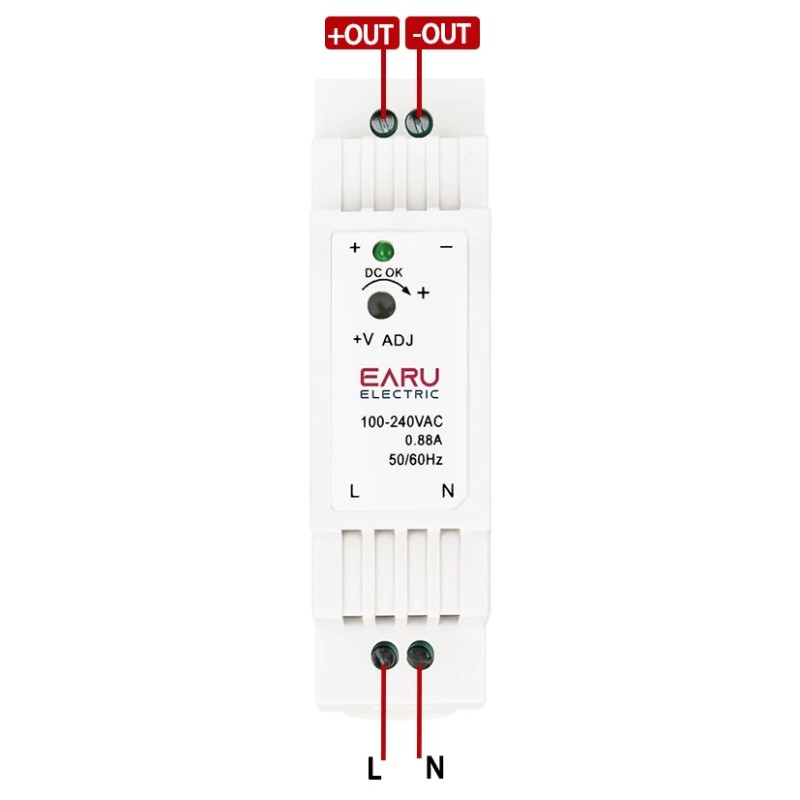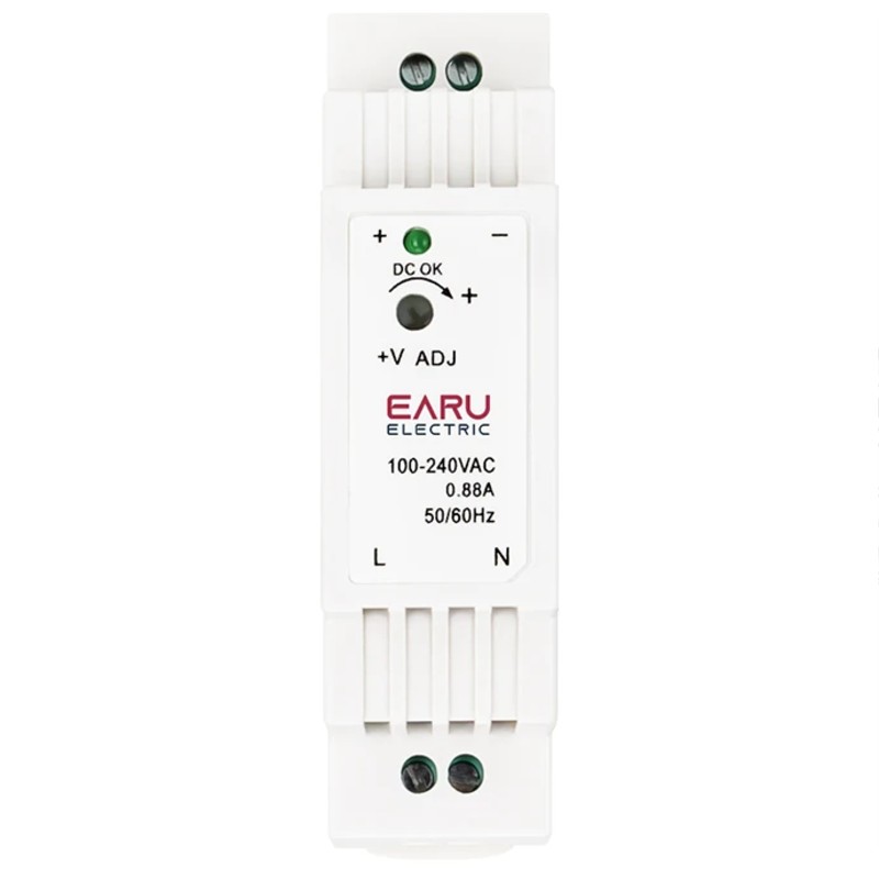 EARU DR-15-12. AC-DC Industrial DIN rail power supply. Output 12Vdc at 1.25A. Plastic T-shape case