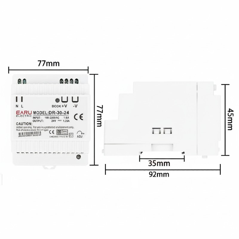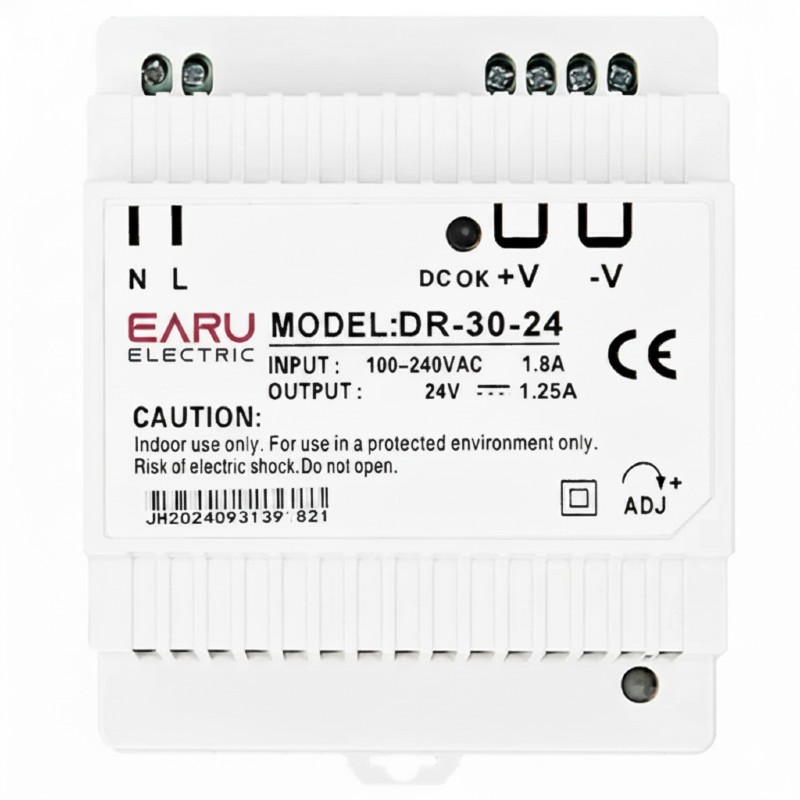 EARU DR-30-24. AC-DC Industrial DIN rail power supply. Output 24Vdc at 1.25A. Plastic T-shape case