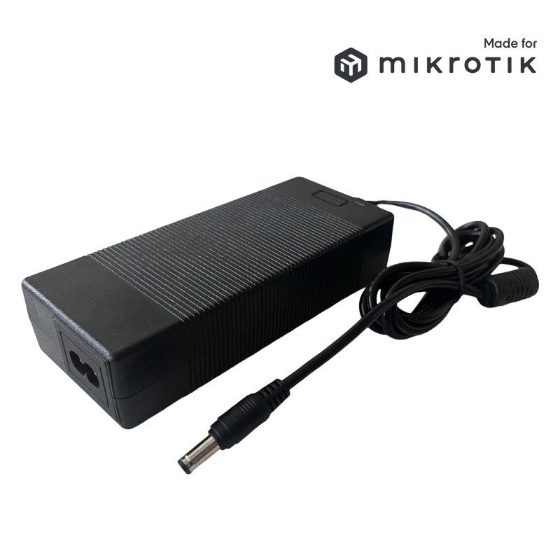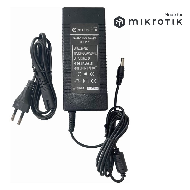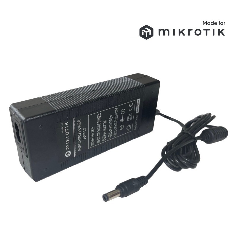 MikroTik OEM power adapter with standard 5.5 / 2.1mm DC connector designed to power devices with 48V DC input voltage.