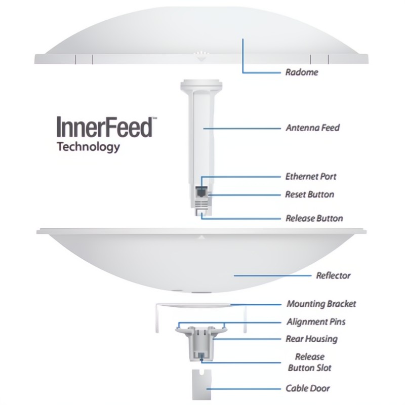 Η τεχνολογία InnerFeed™ της Ubiquiti ενσωματώνει το ραδιόφωνο στην κεραία τροφοδοσίας, οπότε δεν υπάρχει ανάγκη για καλώδια που να συνδέουν το ραδιόφωνο με την κεραία.