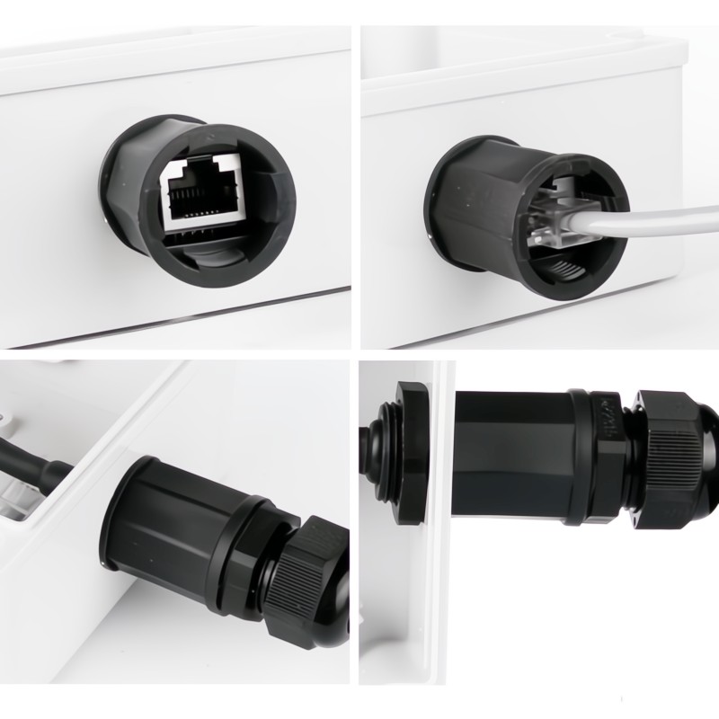 The system features a standard RJ45 Receptacle mounted in a UV protected housing and a mating cable gland which passes an RJ45 connector and seals the cable to IP67 requirements.