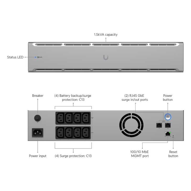 UniFi managed 1.5kVA rackmount uninterruptible power supply with 4 backup outlets, 4 surge outlets, and a field replaceable battery, 216Wh, half load (500W) runtime of 8 minutes.