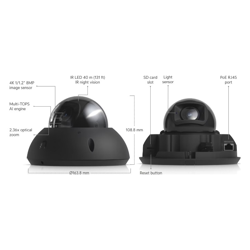 The UVC-G6-Pro-Dome is a high-performance, all-weather 4K PoE+ camera designed for professional surveillance.