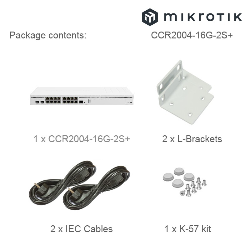 CCR2004-16G-2S+ : This powerful and affordable router crushes all previous CCR models in single-core performance. 16x Gigabit Ethernet ports, 2x10G SFP+ cages, active cooling and the best single-core performance per watt & best overall performance per watt among all the CCR devices.