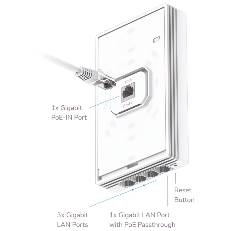 A wall-mounted WiFi AP with a built-in 5-GbE switch ideal for covering a room or ensuite in hospitality environments. One PoE output allows for connecting an IP phone or other PSE-enabled devices.