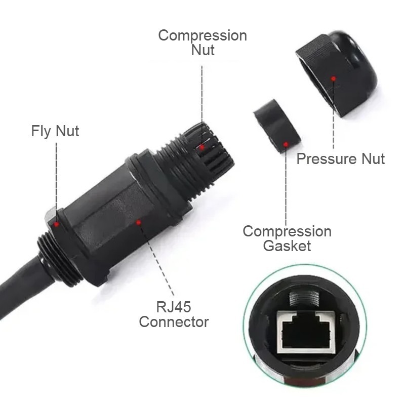 The system features a standard RJ45 Receptacle mounted in a UV protected housing and a mating cable gland which passes an RJ45 connector and seals the cable to IP67 requirements.