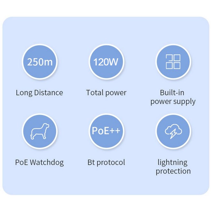 Total PoE budget of 120W, low internal consumption and power supply via a 230V AC connector thanks to the built-in power supply.